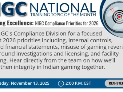 The NIGC serves tribal entities in a vast number of professional disciplines, in pre-existing courses designed to focus on routine and ongoing needs, as well as flexible, targeted technical assistance to address critical emergent issues. Instruction is offered at the awareness, performance and management levels. Participants attend NIGC courses with the basic skills of their profession and learn how to apply them in the context of gaming regulatory preparedness and compliance.